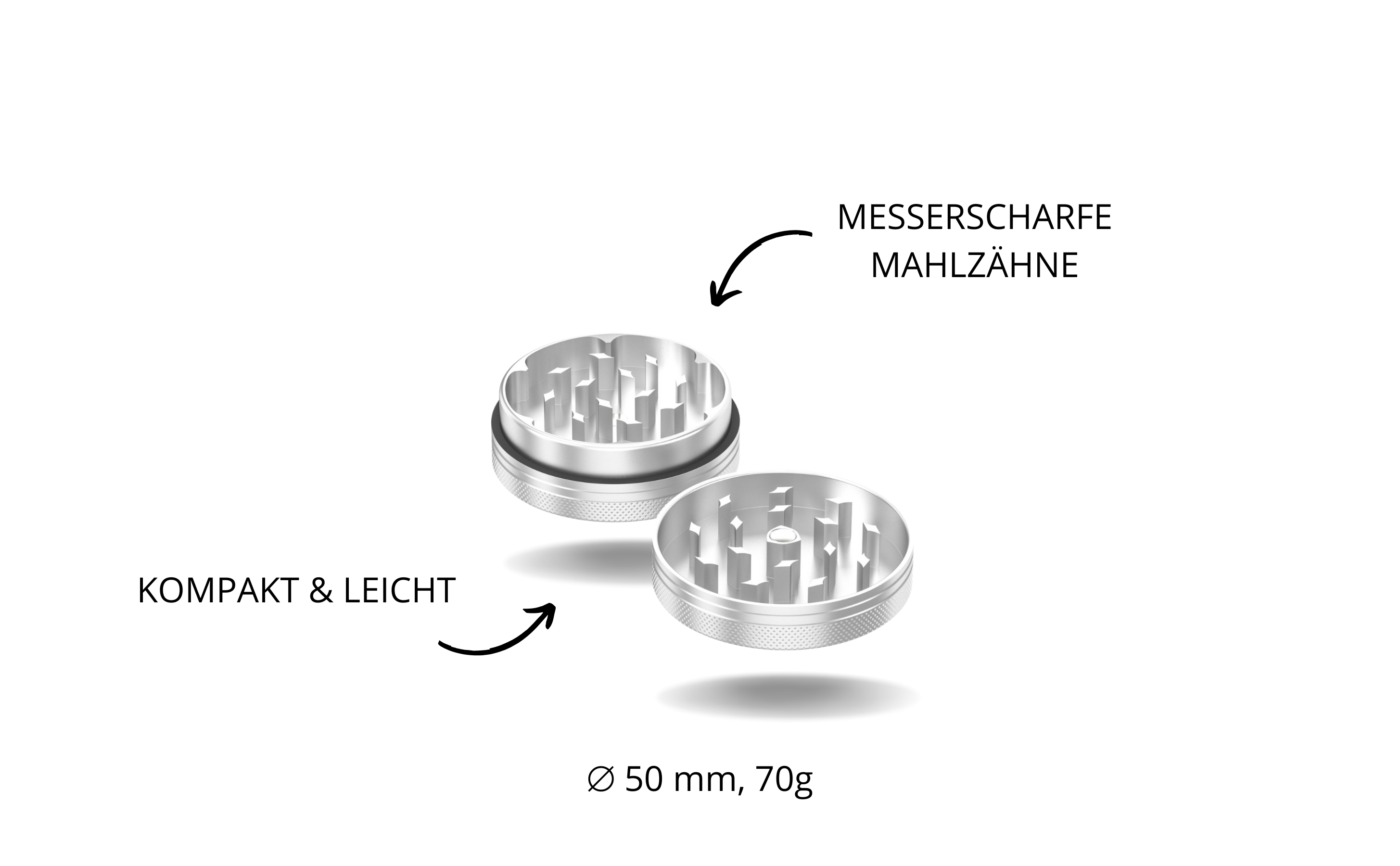 Der 2-teilige Grinder überzeugt durch höchste Verarbeitungsqualität und Langlebigkeit. Gefertigt aus Aluminium in Raumfahrtqualität, bietet dieser Alu-Grinder mit einem Durchmesser von 50 mm und einem Gewicht von 70 g die ideale Balance zwischen Stabilität und Handlichkeit.