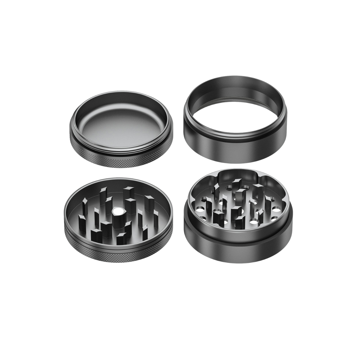 Der vierteilige Grinder setzt sich wie folgt zusammen: Oben der gezahnte Mahldeckel, darunter die passgenaue Mahlkammerbasis mit den Mahlzähnen. Es folgt die Sieb- und Auffangkammer, während das untere Pollenfach bei Bedarf flexibel abgenommen werden kann.