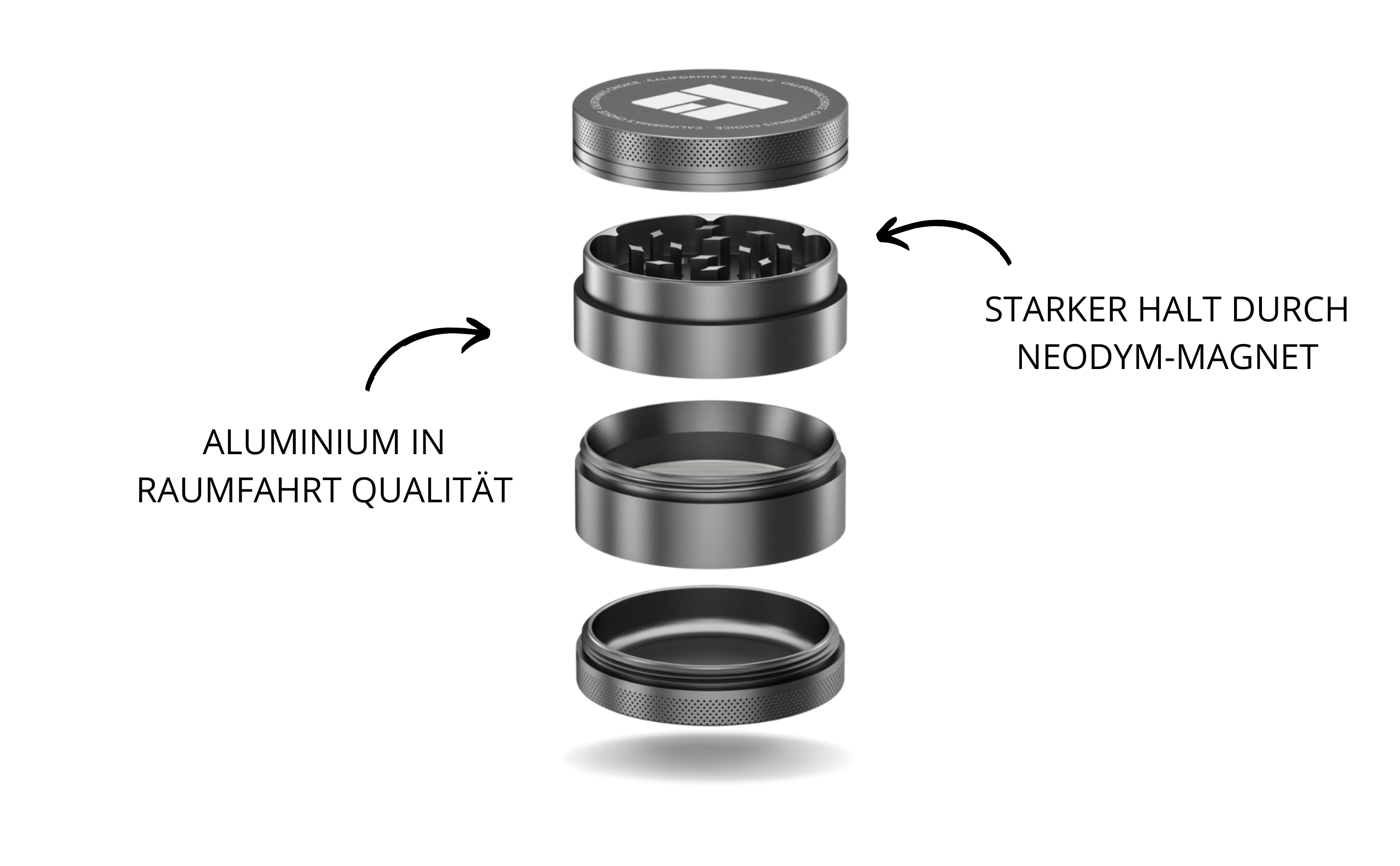 Der 4-teilige Compton Grinder besteht aus eloxiertem, CNC-gefrästem Aluminium in Raumfahrtqualität. Diese besonders starke Legierung vereint Korrosionsbeständigkeit mit geringem Gewicht und außergewöhnlicher Stabilität.