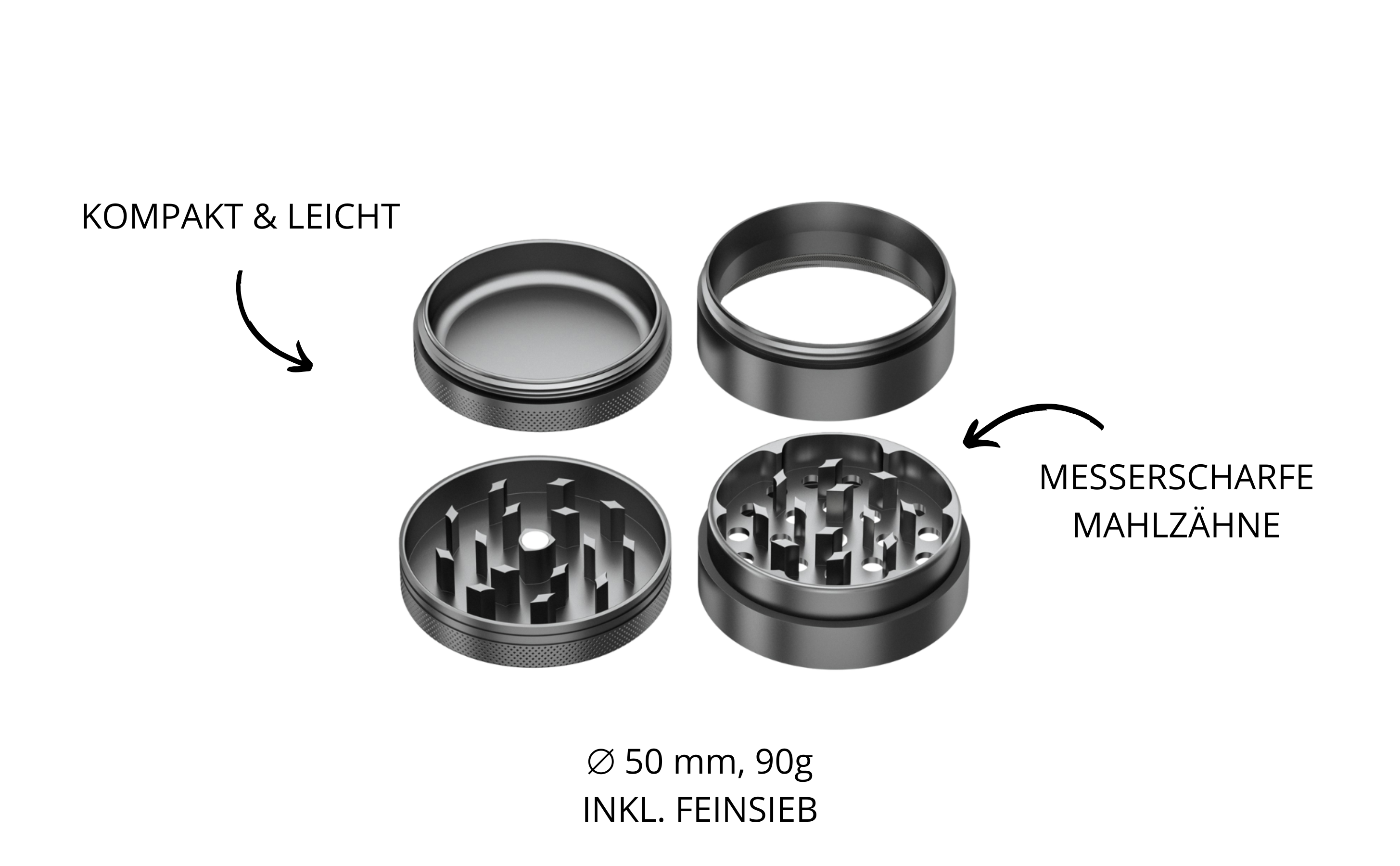 Der 4-teilige Grinder überzeugt durch höchste Verarbeitungsqualität und Langlebigkeit. Gefertigt aus Aluminium in Raumfahrtqualität, bietet dieser Alu-Grinder mit einem Durchmesser von 50 mm und einem Gewicht von 90 g die ideale Balance zwischen Stabilität und Handlichkeit.