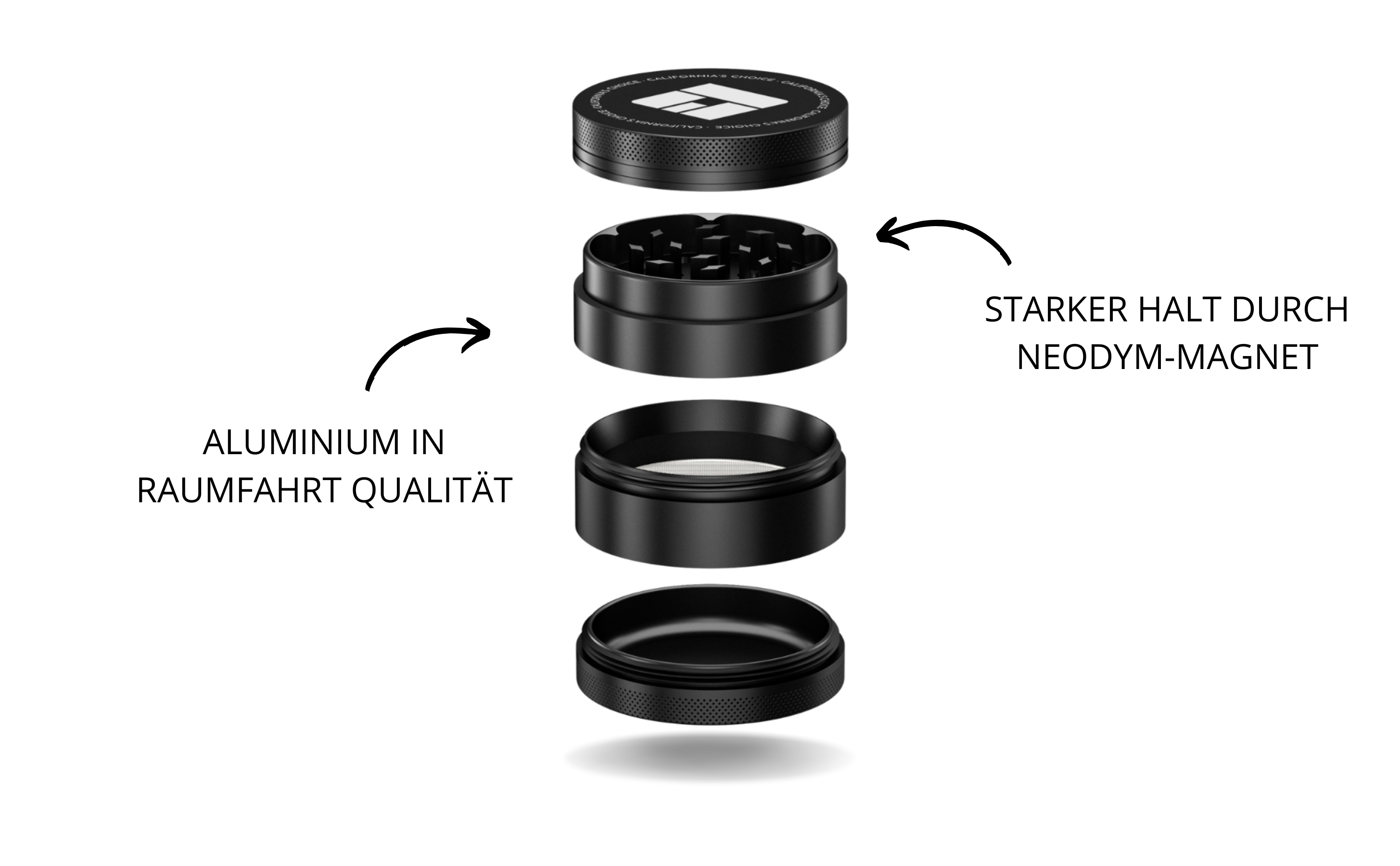 Der vierteilige Grinder besteht aus dem gezahnten Deckel, der Mahlkammer, der Sieb- und Auffangkammer sowie einem abnehmbaren Pollenfach.