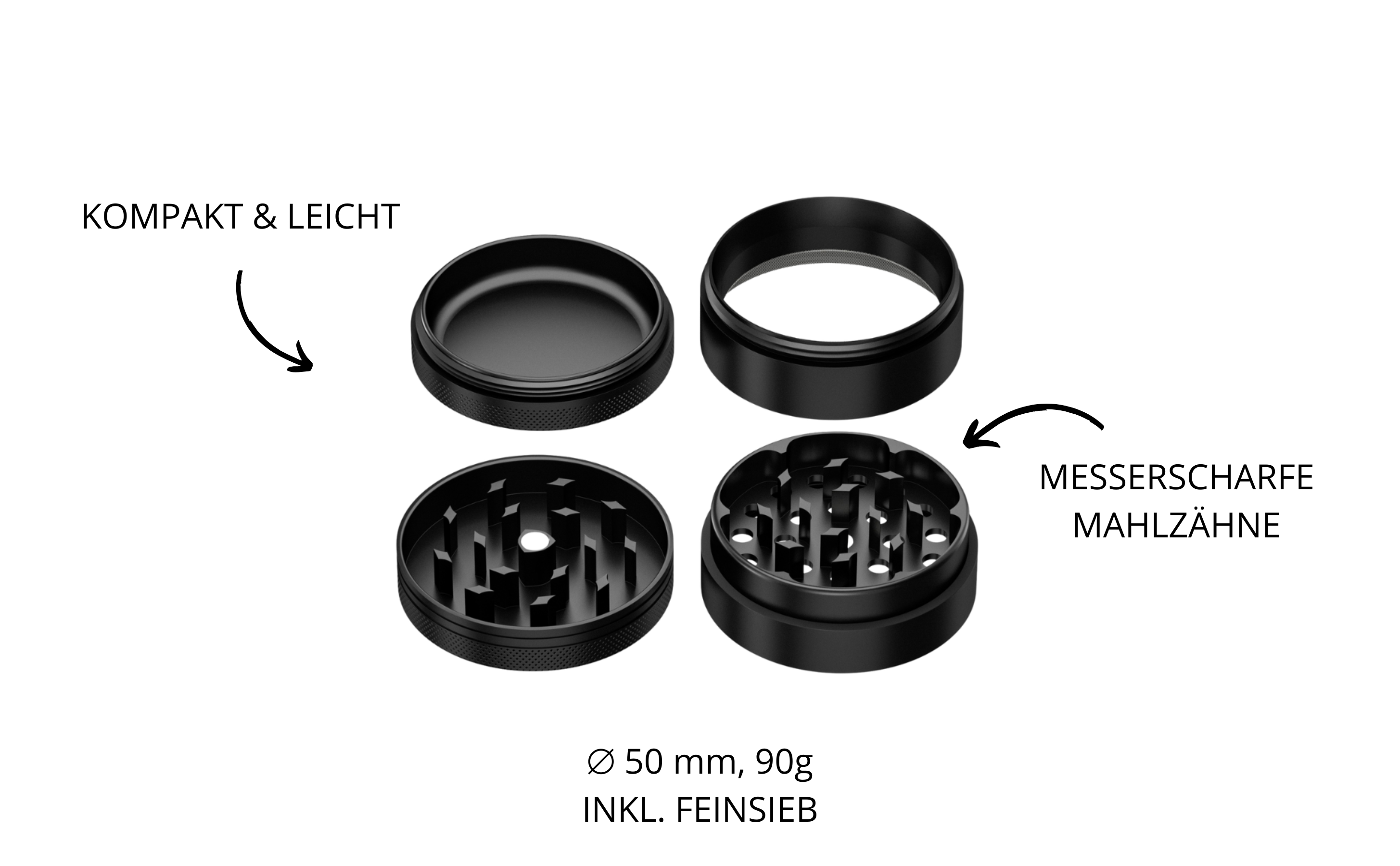 Der 4-teilige Grinder überzeugt durch höchste Verarbeitungsqualität und Langlebigkeit. Gefertigt aus Aluminium in Raumfahrtqualität, bietet dieser Alu-Grinder mit einem Durchmesser von 50 mm und einem Gewicht von 90 g die ideale Balance zwischen Stabilität und Handlichkeit.