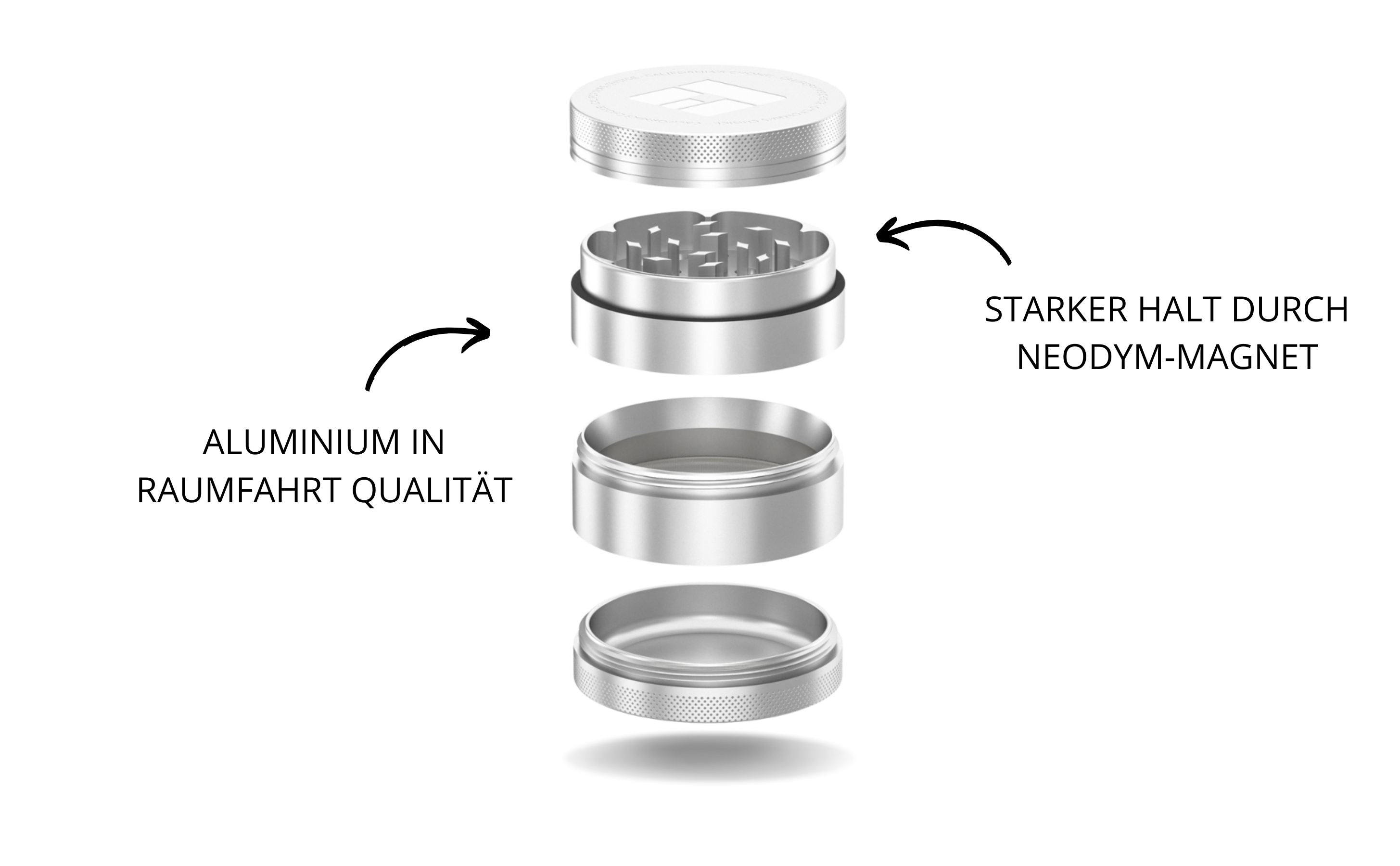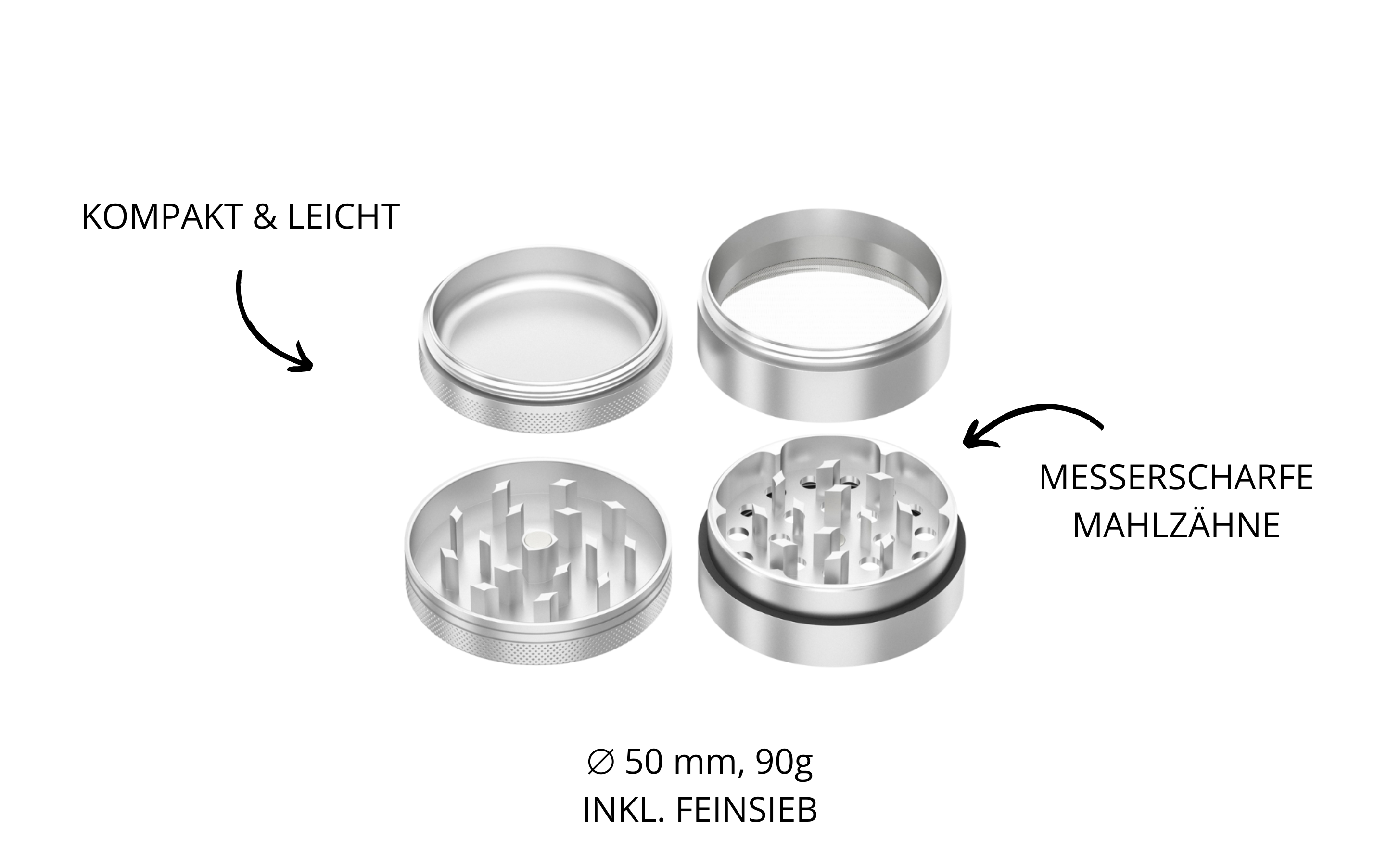 Der 4-teilige Grinder überzeugt durch höchste Verarbeitungsqualität und Langlebigkeit. Gefertigt aus Aluminium in Raumfahrtqualität, bietet dieser Alu-Grinder mit einem Durchmesser von 50 mm und einem Gewicht von 90 g die ideale Balance zwischen Stabilität und Handlichkeit.