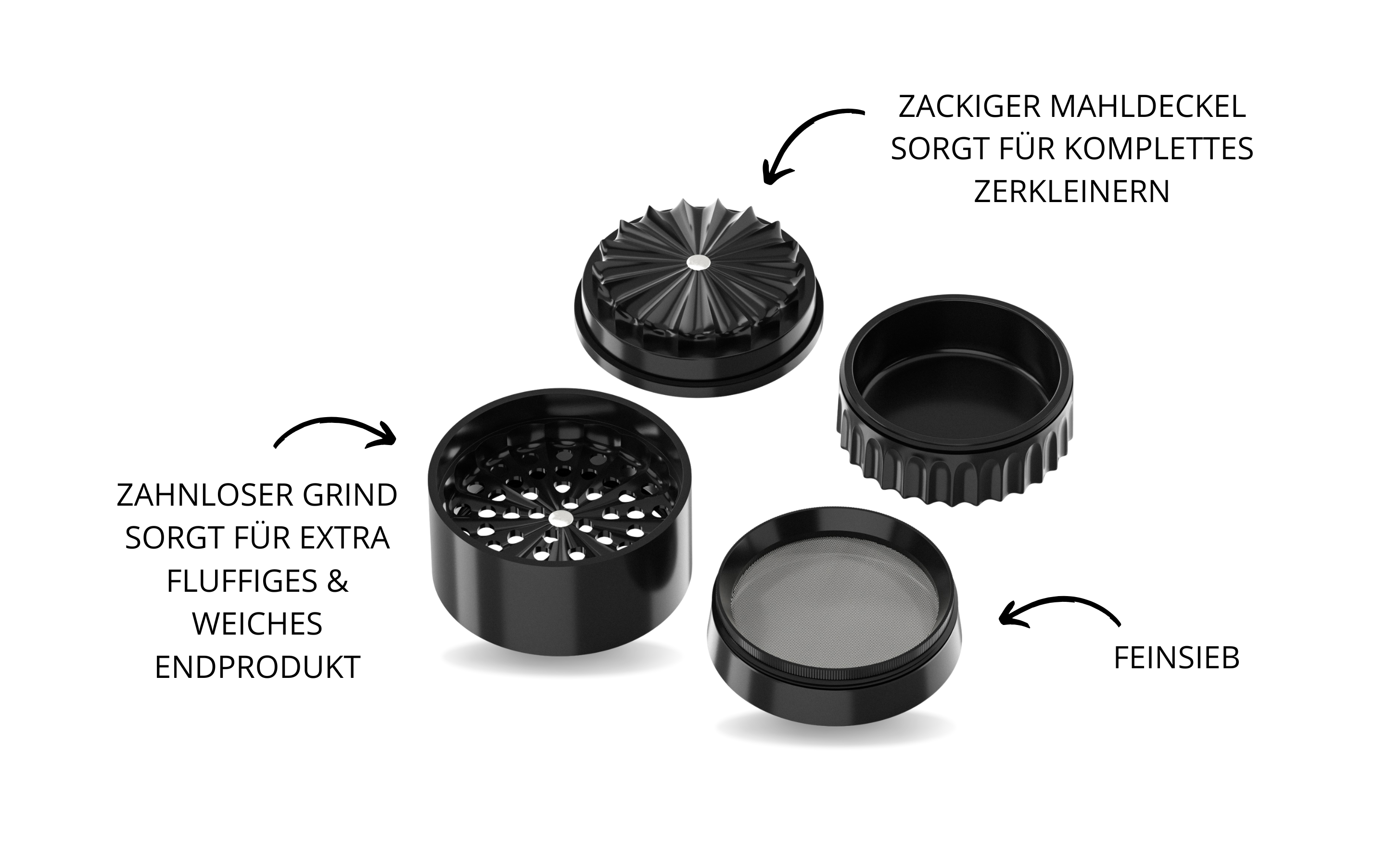 Anstelle herkömmlicher Mahlzähne verwendet dieser Grinder ein innovatives „Sunray“-Blüten-Design. Das schonende Mahlprinzip sorgt dafür, dass Blüten locker und gleichmäßig zerkleinert werden und eine fluffige Konsistenz behalten.