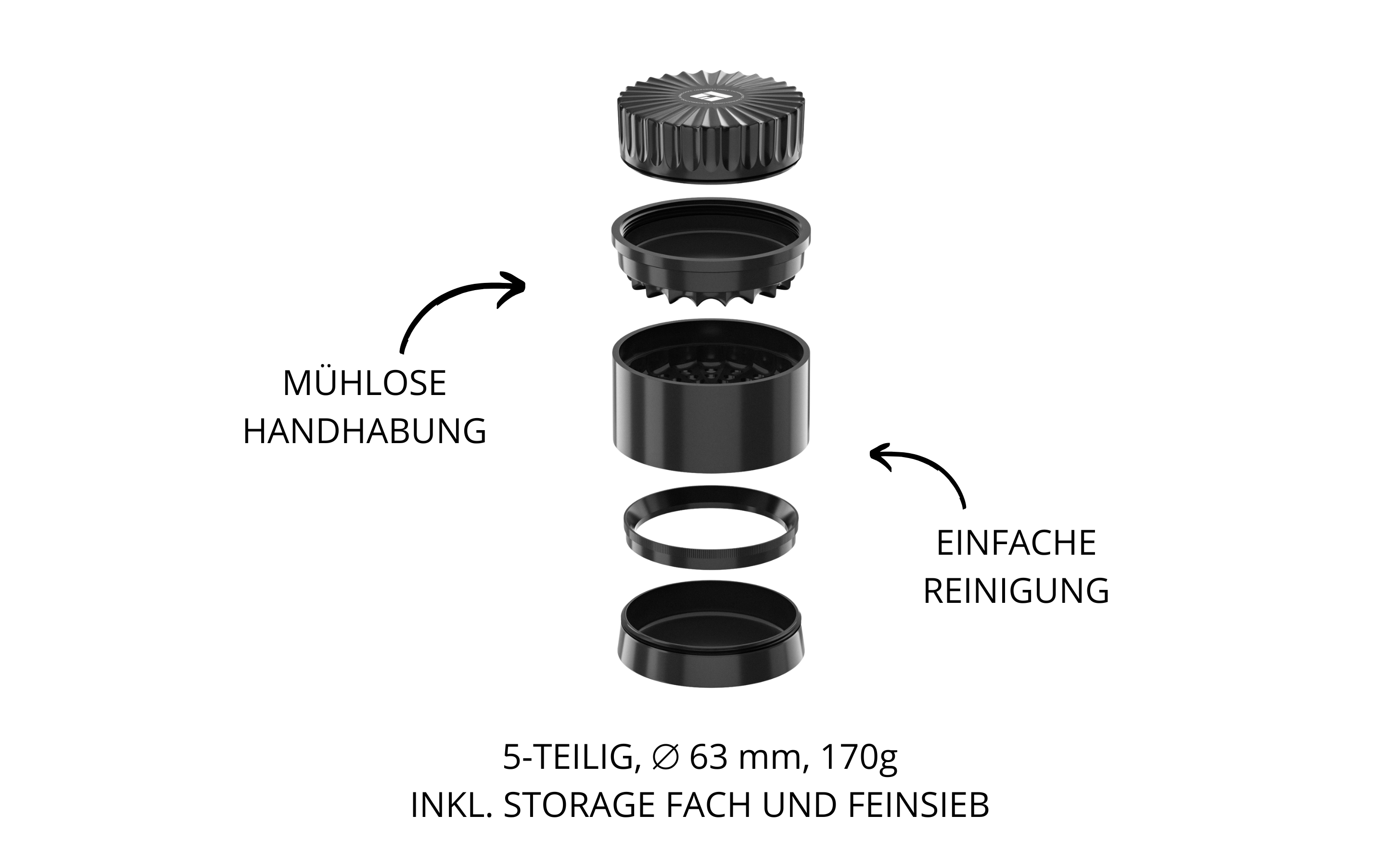 Fünf Teile – durchdacht angeordnet: Mahldeckel, Zusatzfach, die passende Mahlkammerbasis, Sieb- und Auffangkammer sowie das abnehmbare Pollenfach.
